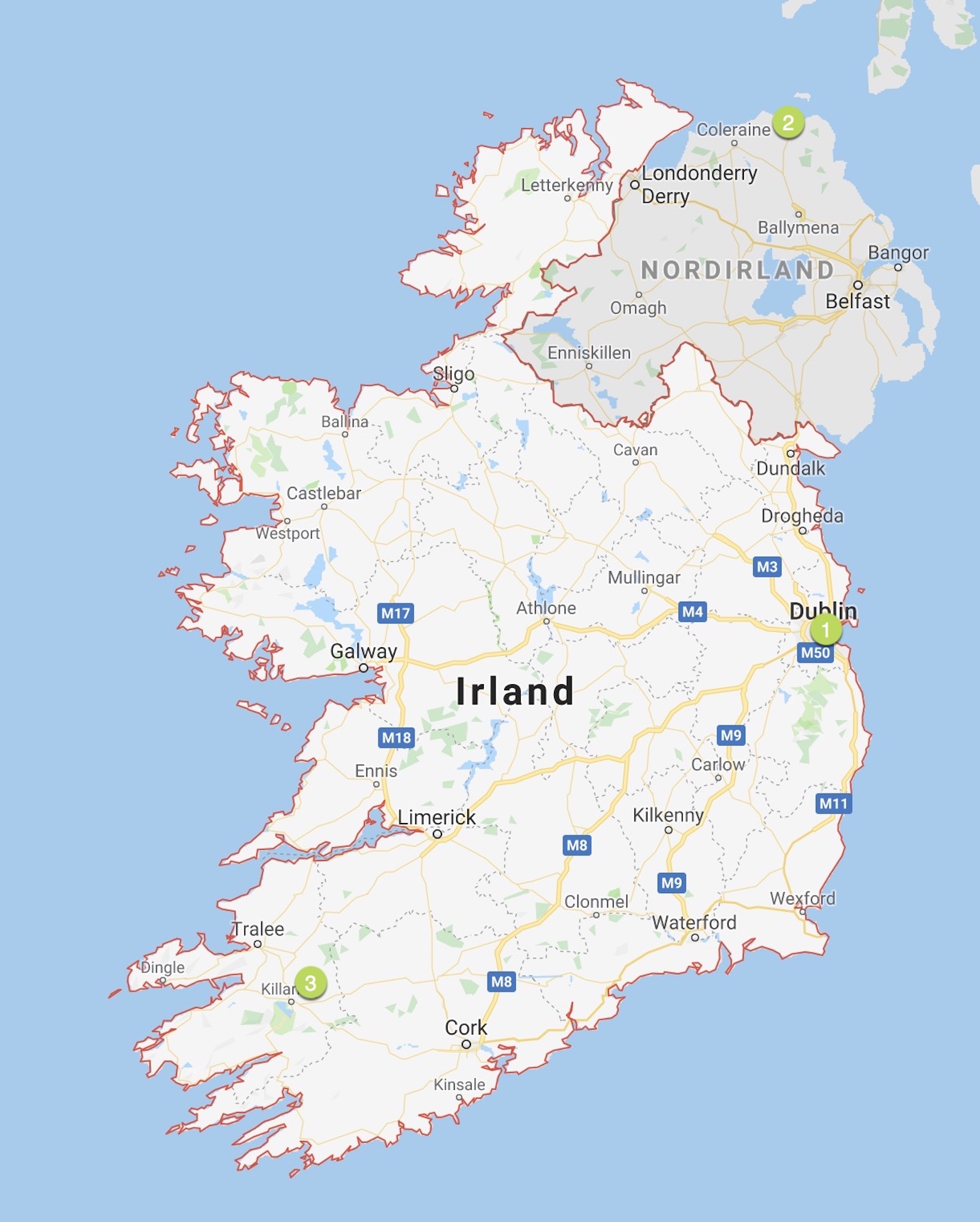 Unsere Reise führte uns durch Frankreich nach Cherbourg und von dort mit der Fähre nach Rosslare. In Irland angekommen, wohnten wir eine Woche in einer Ferienwohnung in Dublin (1), eine Woche in einem Wohnturm in Ballycastle, Nordirland (2) und eine Woche in einem Cottage in Killarney (3).