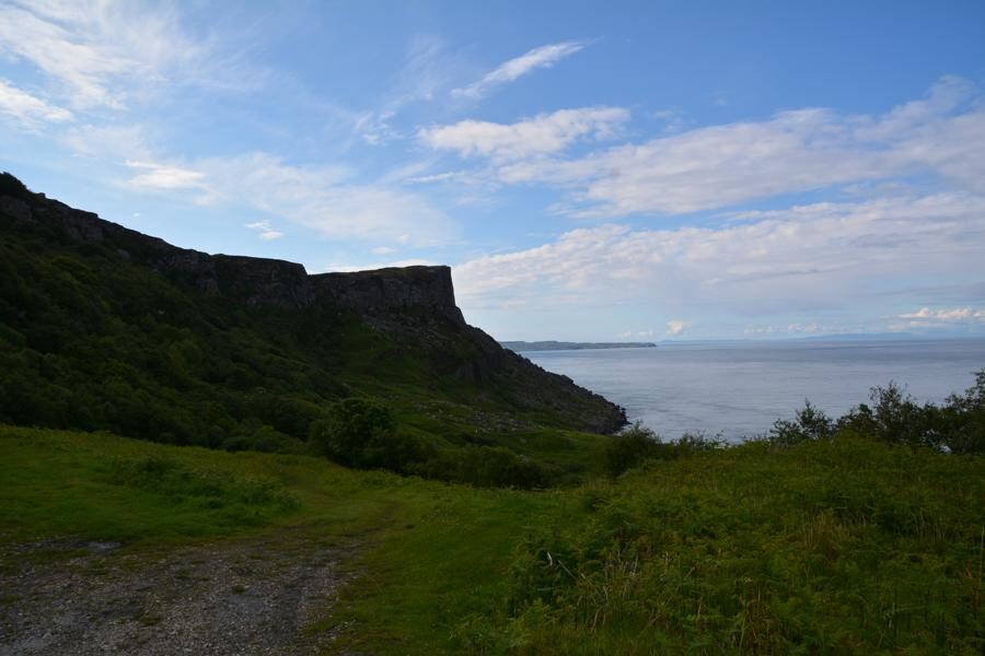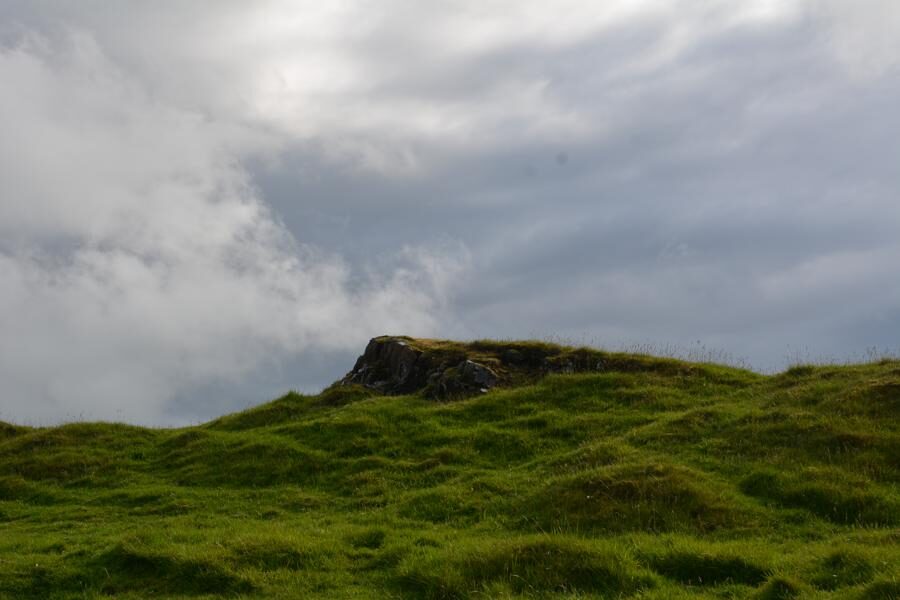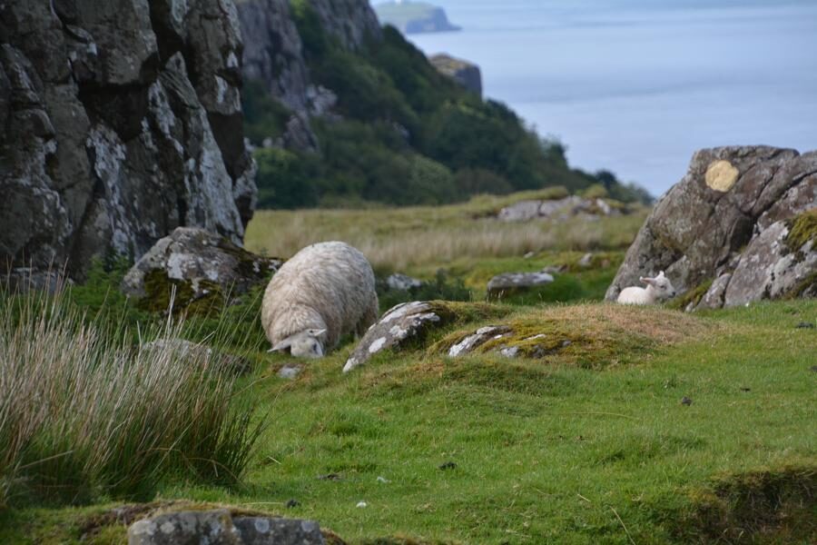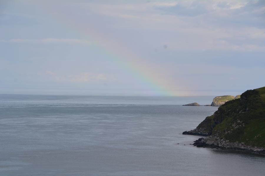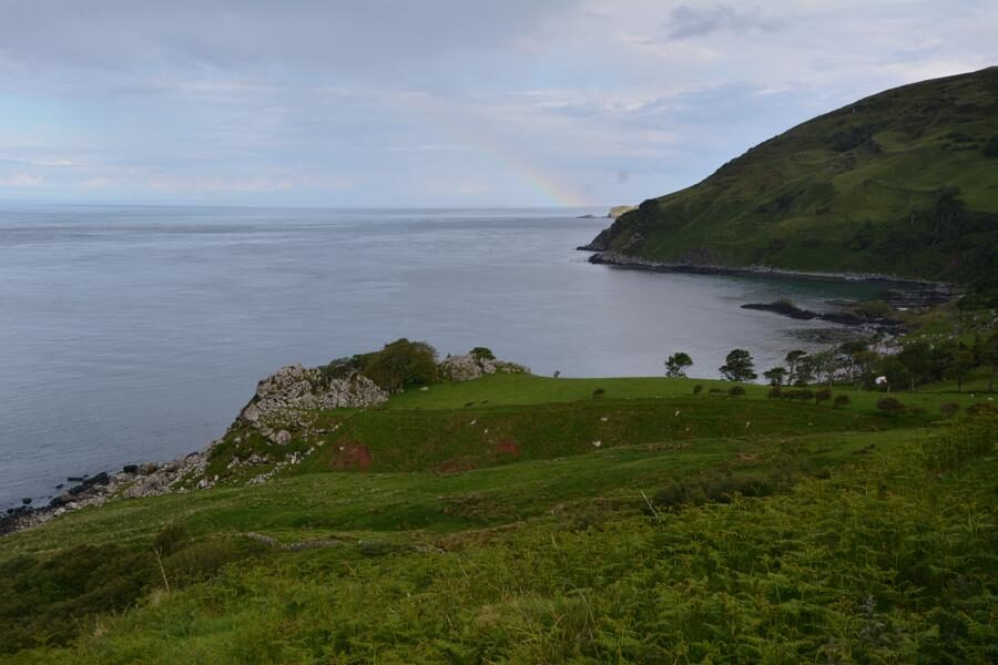 Noch etwas weiter östlich an der Küste gelangen wir ins Land der Schafe – sie sind überall, neben der Strasse, auf der Strasse, im Gehege, ausserhalb des Geheges… In dieser verwunschenen Landschaft sind gemäss einer Informationstafel einige Szenen von „Game of Thrones“ gedreht worden. Und auch hier glänzt nochmals ein Regenbogen!